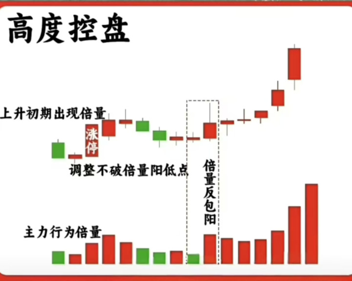 1. 高度控盘洗盘:上升初期放倍量,调整不破倍量阳低点,倍量反包阳后开启拉升。