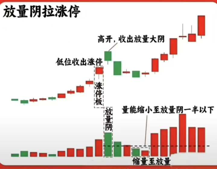 4. 放量阴拉涨停洗盘:低位涨停后高开放量大阴,量能缩至大阴一半以下,后续再拉涨停。