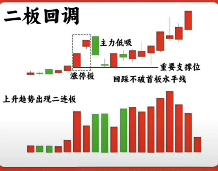 6. 二板回调洗盘:上升趋势二连板后回调,不破首板支撑位,主力低吸后再度拉升。
