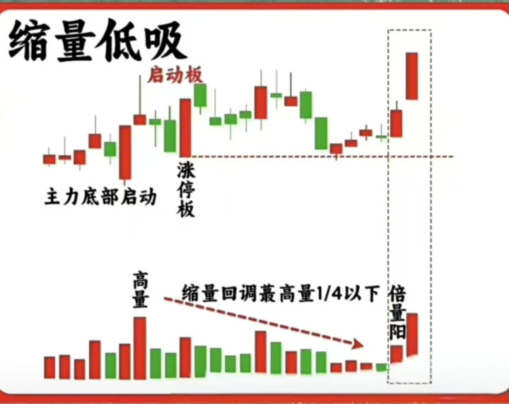 3. 缩量低吸洗盘:底部启动涨停后,缩量回调至最高量1/4以下,倍量阳出现即低吸时机。