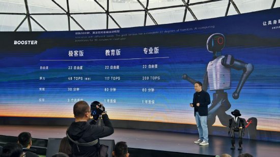 据介绍,BOOSTER K1具身开发入门平台全系拥有22自由度,共有极客版、教育版、专业版三个版本,现场,两台机器人表演了迈克尔杰克逊经典的“太空步”舞蹈,程昊表示,产品限时售价2.99万起,支持二次开发,身高1m,体重19kg。官方表示,该机器人算力强劲等特点,主要面向教育、赛事、展演等场景。